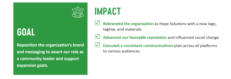 Unrestricted, multi-year revenue allows innovation, unlocks new growth opportunities, and is foundational in creating a sustainable and diversified funding portfolio. Hope Solutions plans to launch a growth Campaign to expand our reach, refine programs, and increase our housing stock. Conducting a landscape analysis to sharpen the work of the development and external relations department will be instrumental in formalizing new strategies to increase unrestricted operating funds and to better position the organization as the nonprofit of choice for wealth managers and local donor-advised funds. To expand our brand visibility, Hope Solutions will publish an annual impact report highlighting our outcomes and system-influence efforts to share with key stakeholders.