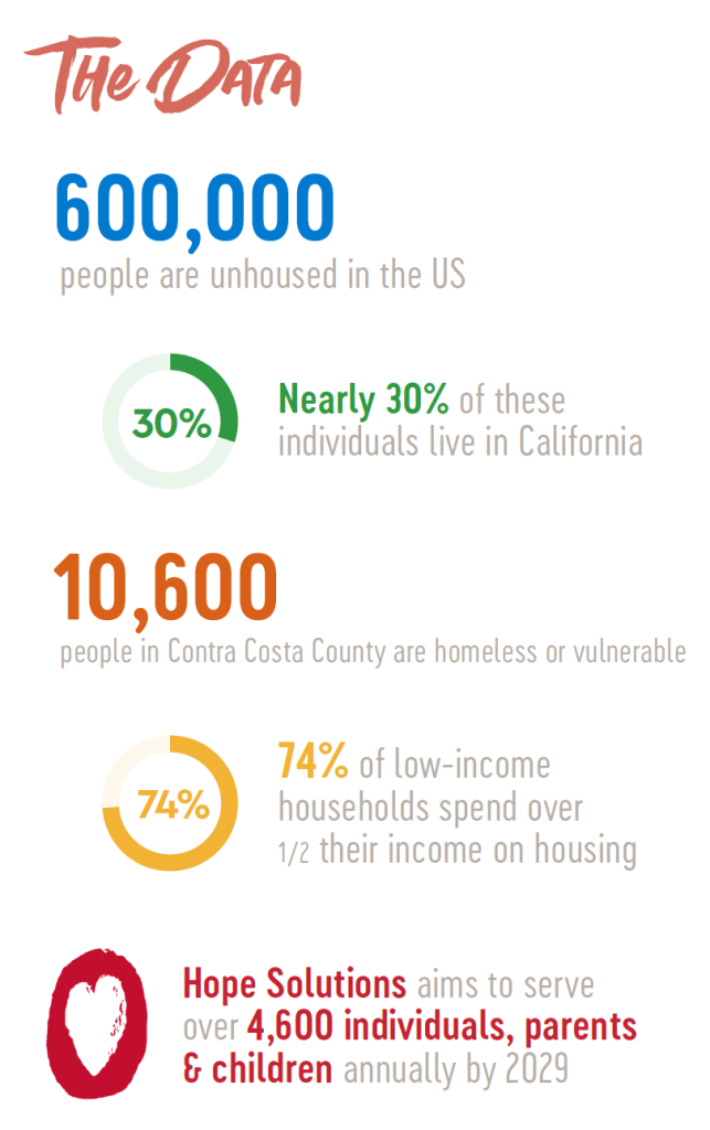 The primary cause of homelessness is the lack of affordable housing. Nearly 600,000 people are unhoused in the United States. Almost thirty percent, or 172,000, of these individuals live in California. Contra Costa County is feeling the weight of this crisis as it continues to experience high housing costs, a lack of affordable housing, and the need for better-paying jobs. With only a two percent vacancy rate, over 30,000 low-income renter households in the County do not have access to affordable homes. These issues are compounded by families, youth, and seniors needing more emergency and supportive services. Currently, 7,725 households (10,600) people are vulnerable to or experiencing homelessness in our community, a three percent increase since 2019. However, in 2022, Contra Costa County had only 1,136 beds available in the interim and permanent housing supply for persons experiencing homelessness. The spike in homelessness includes a thirty-two percent increase in households with children and a thirty-six percent increase in households with seniors. The stark gap between wages and the soaring cost of housing in the County underscores the challenges low-income households and people experiencing homelessness face when trying to secure stable housing and build back their lives. Renters in Contra Costa County must earn $42.69 per hour – nearly three times California’s minimum wage – to afford the average monthly asking rent of $2,200. Seventy-four percent of extremely low-income households in Contra Costa County are paying more than half their income on housing costs compared to zero percent of moderate-income households. Hope Solutions is uniquely positioned to meet these challenges, continuing to expand permanent housing solutions and client-centered support services in Contra Costa County. Our approach cost-effectively improves housing stability and health outcomes, increases independence, builds community, and breaks the cycle of poverty.
