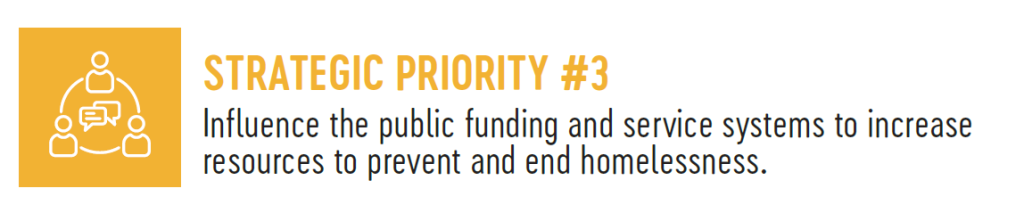STRATEGIC PRIORITY #3: Influence the public funding and service systems to increase resources to prevent and end homelessness..